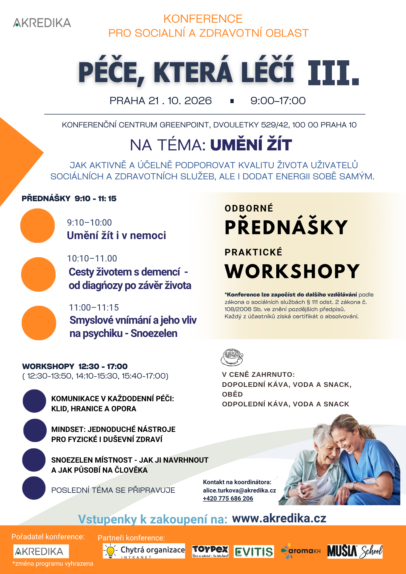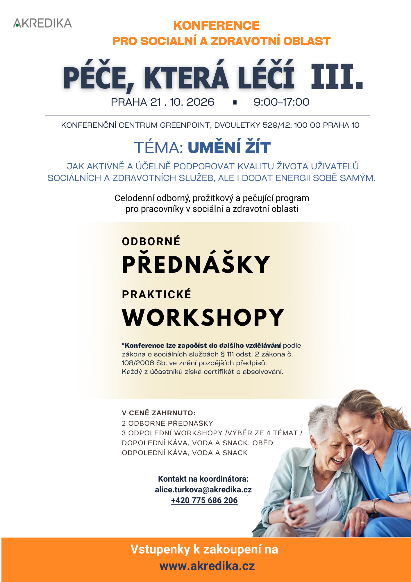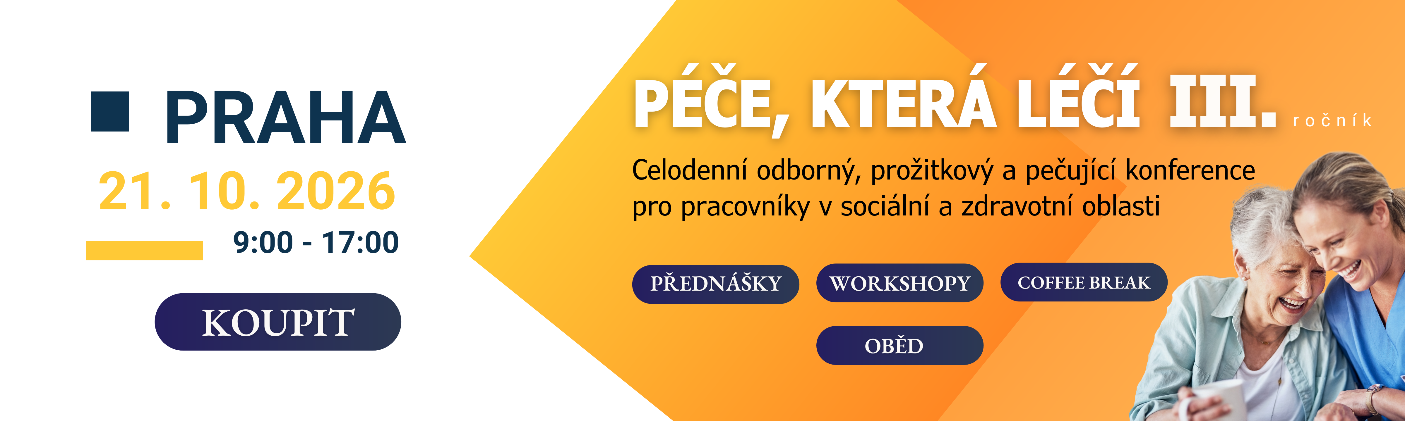 Třetí ročník konference "Péče, která léčí" navazuje na velmi úspěšný první a druhý ročník a opět nabídne odborné přednášky, interaktivní workshopy, sdílení zkušeností, které obohatí každodenní praxi. To vše v příjemném prostředí, které posiluje nejen profesní růst, ale i duševní pohodu a motivaci pracovníků pečujících v sociálních a zdravotních oborech více o konferenci a předprodej vstupenek zde