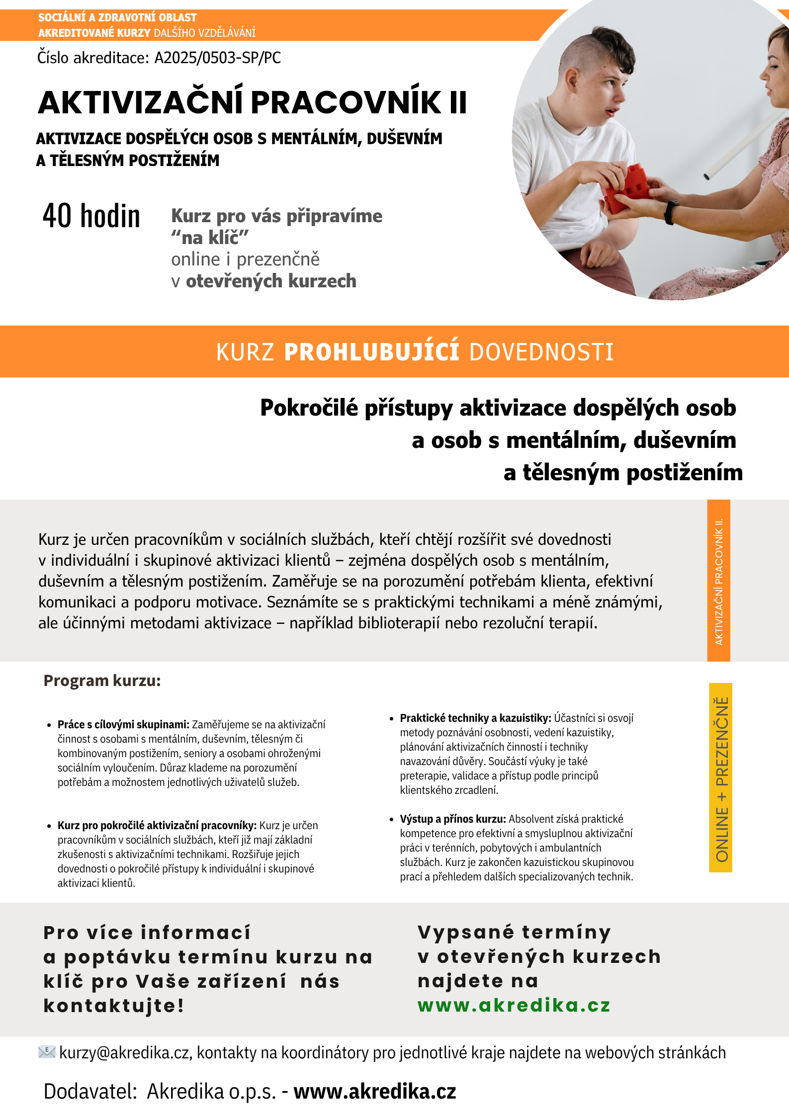 | Název kurzu | Aktivizační pracovník II. - Aktivizace dospělých osob s mentálním, duševním a tělesným postižením |